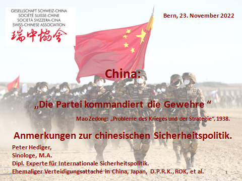 Le mercredi 23 novembre 2022, M. Peter HEDIGER a donné une conférence en allemand sur ce thème (Le Parti commande aux fusils - Notes sur la politique chinoise de sécurité). Sinologue, historien et expert en politique de sécurité internationale, il a été attaché de défense en Chine et au Japon.